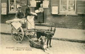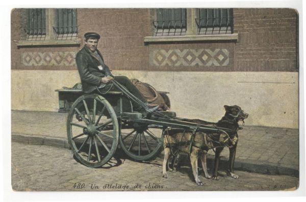 A Roubaix, on croisait plus facilement les chiens dans les rues et sur les chemins, tirant des charrettes menées par des travailleurs. De nombreuses personnes exerçant des métiers dits modestes ont eu recours à cette force de traction, bien moins onéreuse à l’achat et à l’entretien qu’un cheval ou un mulet. A partir du milieu du XIXe siècle, voici donc des boulangers faisant leur tournée dans les quartiers, des vendeurs de journaux et autres marchandes des quatre saisons équipés de charrettes à chien, plus communément appelées dans nos contrées "carrettes à quien".