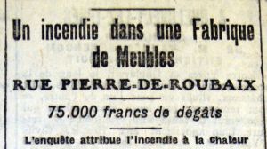 En Août 1911, un incendie ravage l’entreprise de la rue Pierre de Roubaix, détruisant un lieu de stockage de meubles de grande valeur, un atelier de production de voitures d’enfants, et une partie de l’habitation. Le préjudice s’élève à 75.000 Frs. Les assurances permettent heureusement de rembourser les frais et de reconstruire les locaux.