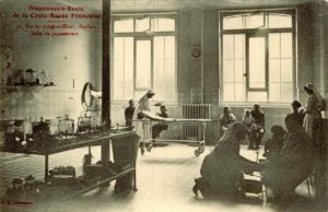 Le même bâtiment accueille les élèves infirmières (de 19 à 35 ans) qui viennent y effectuer leur stage d’instruction pour devenir hospitalières ou pour se former à la puériculture et aux soins à donner aux malades et aux blessés. Onze médecins viennent bénévolement donner des cours. Une infirmière raconte : "Je suis entrée à l’école de la croix rouge qui se trouvait dans les locaux du dispensaire de la rue Edouard Anseele en 1959. J’y ai préparé un diplôme d’auxiliaire de puériculture. J’ai suivi des consultations de nourrissons avec le docteur Ratel, des consultations de dispensaire avec le docteur Beaugrand. J’y ai appris à soigner la gale ! Je restais avec des enfants installés sur une table avec les yeux protégés pour des séances de rayons ultra violet pour soigner le rachitisme. Puis j’ai commencé mes études d’infirmière toujours à l’école de la Croix Rouge. Je faisais des visites à domicile pour des piqûres ou des pansements."
