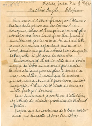 Jean Lebas dit aller bien et il attend toujours la décision du Tribunal de Berlin. Cette lettre est la dernière que nous conservons de Jean Lebas. Il ne sera jugé que le 21 avril 1942 et condamné aux travaux forcés.