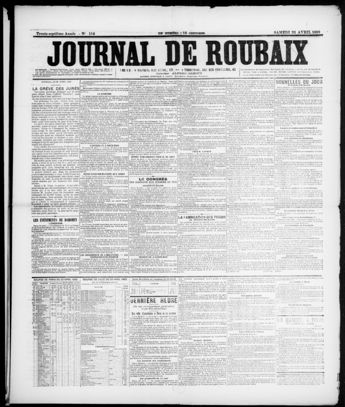 https://www.bn-r.fr/ark:/20179/ALTOBNR116703 Journal de Roubaix book 23 Avril 1892 Journal de Roubaix, 23 Avril 1892 4 p. français Alto