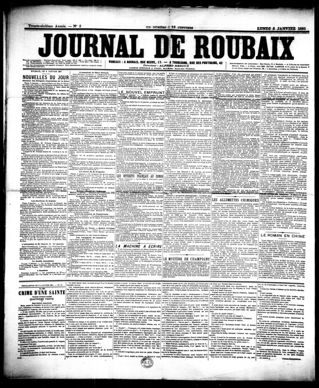 https://www.bn-r.fr/ark:/20179/ALTOBNR116242 Journal de Roubaix book 05 Janvier 1891 Journal de Roubaix, 05 Janvier 1891 4 p. français Alto