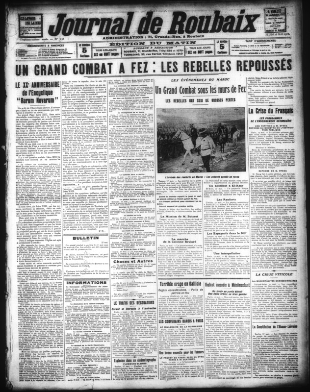 https://www.bn-r.fr/ark:/20179/ALTOBNR64470 Journal de Roubaix book 18 Mai 1911 Journal de Roubaix, 18 Mai 1911 8 p. français Alto