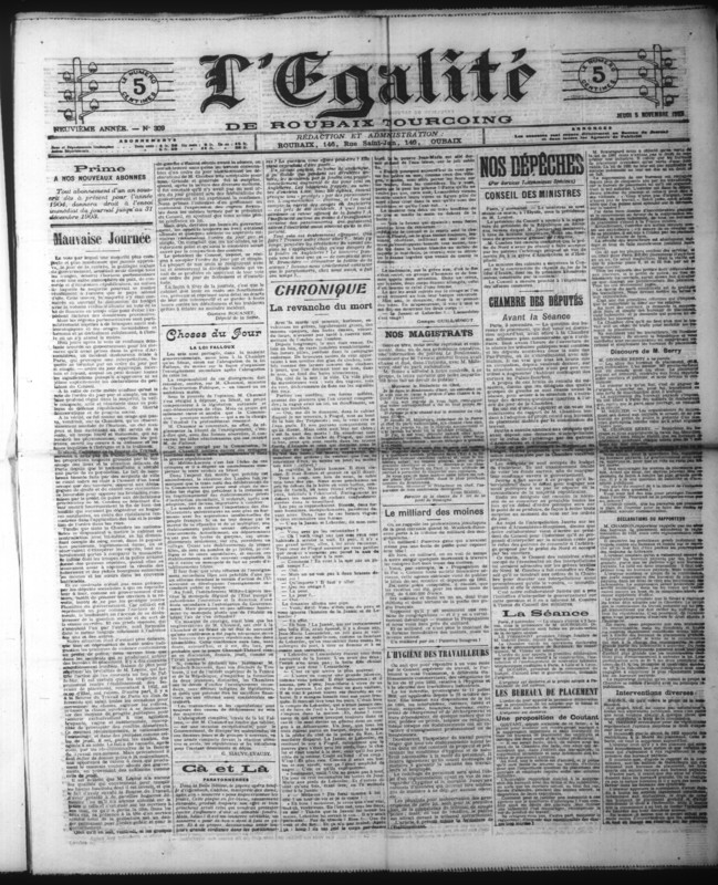 https://www.bn-r.fr/ark:/20179/ALTOBNR90796 L’Egalité Roubaix-Tourcoing book 05 Novembre 1903 L’Egalité Roubaix-Tourcoing, 05 Novembre 1903 6 p. français Alto